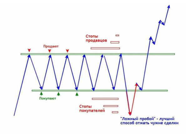 Цена многократно тестирует верхнюю и нижнюю границы диапазона. У верхней границы продавцы активизируются, у нижней — покупатели. Розничные трейдеры быстро привыкают к этой «предсказуемой» картине и начинают размещать ордера предсказуемо: стопы за границами, лимитники внутри, входы на пробой.
