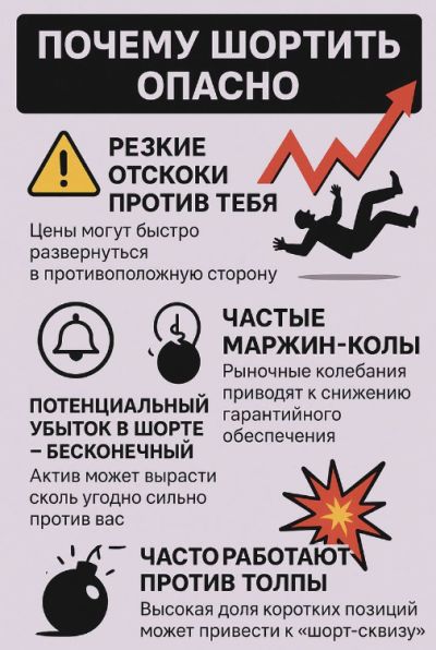 Шорт — это всегда заёмные акции. Любое движение вверх увеличивает убыток без потолка, и: