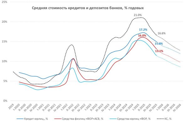 При прогнозируемом снижении ключевой ставки до 12% к концу 2026 года логично ожидать, что стоимость корпоративных займов будет двигаться в аналогичном направлении. Если сегодня средняя ставка по обслуживанию банковского кредита составляет около 15%, то к 2026 году она может снизиться до 13% (против ориентировочных 16,3% в 2025 году).