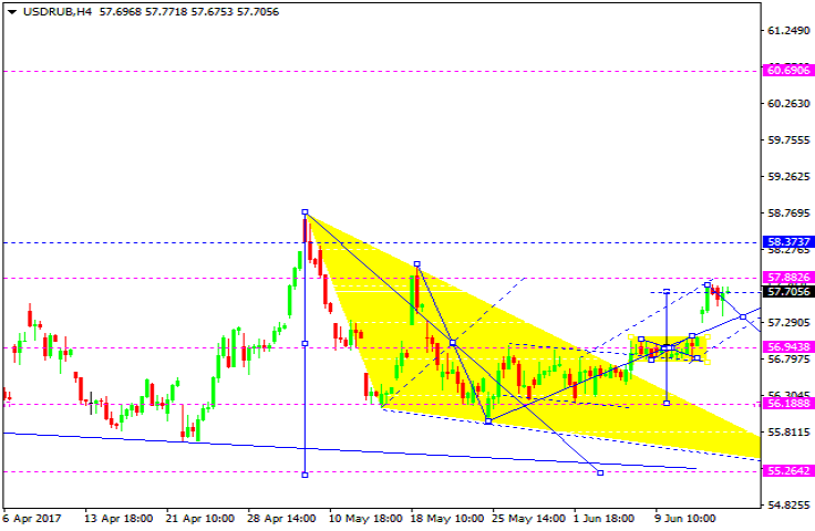 Валютная пара доллар США к российскому рублю исполнил импульс на снижение. С пробоем его минимума ожидаем снижение к уровню 56.94. Далее - рост к 57.88. Затем - снижение к уровню 55.50.