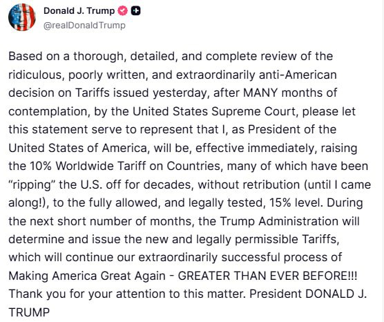 В ответ на решение суда Трамп оперативно ввёл временную надбавку на импорт по разделу 122 Закона о торговле 1974 года. Сначала объявлено 10%, но уже на следующий день президент повысил ставку до максимальных 15% — это предел, разрешённый законом.